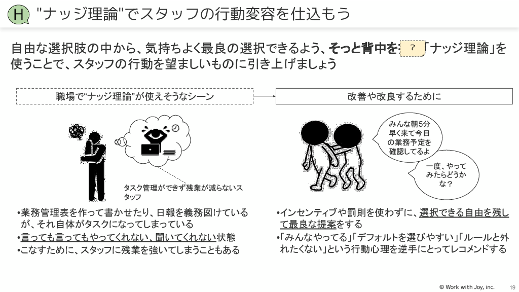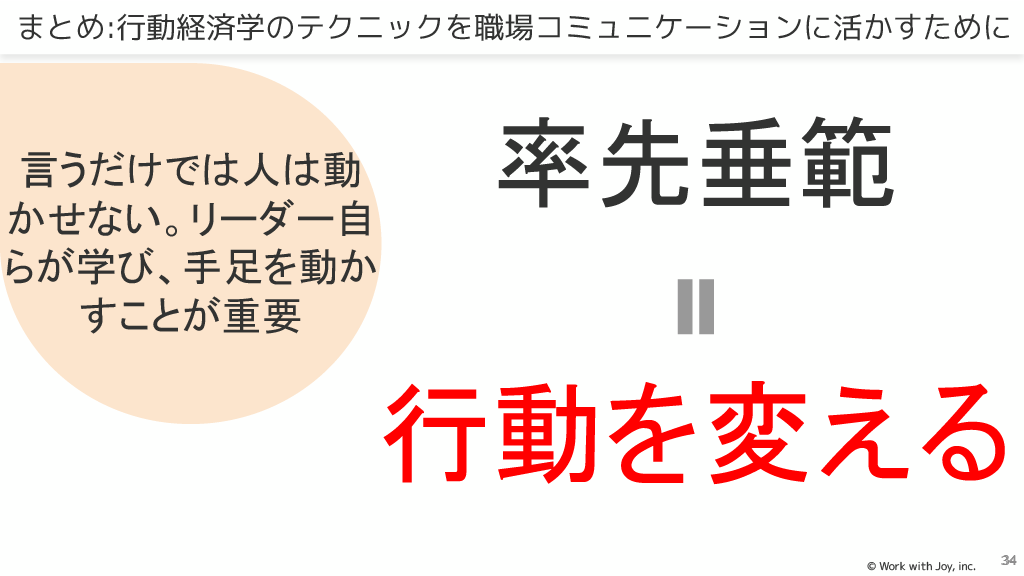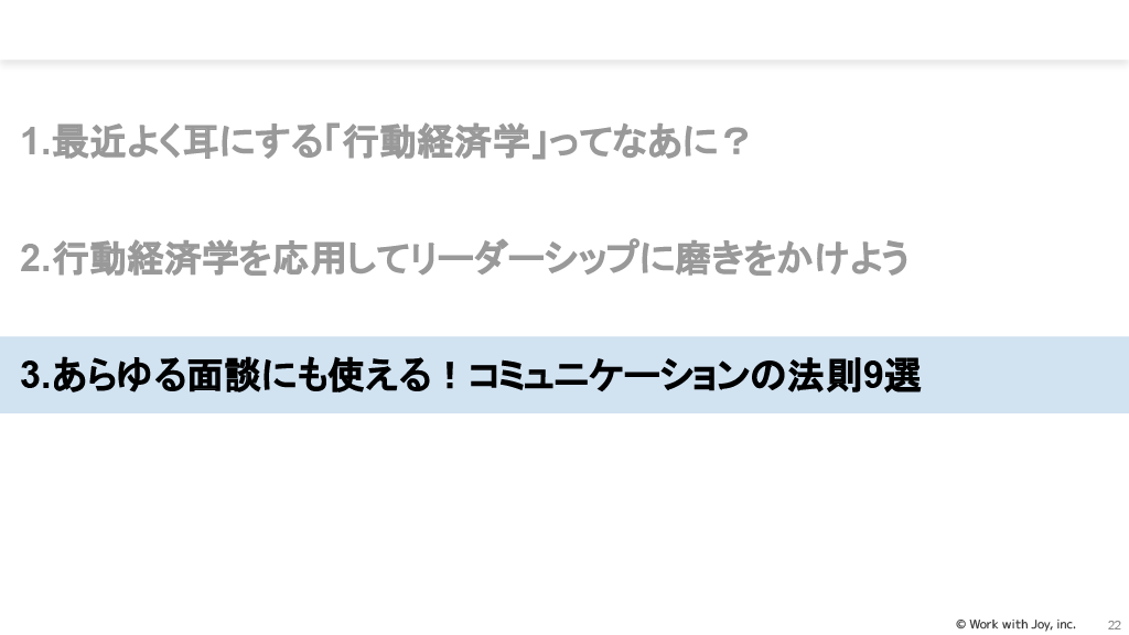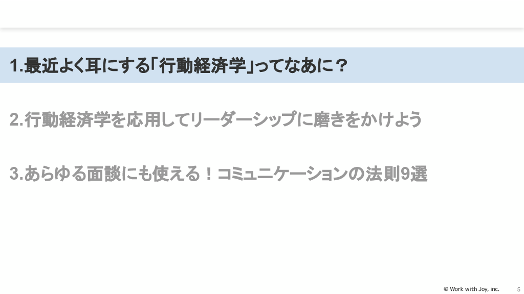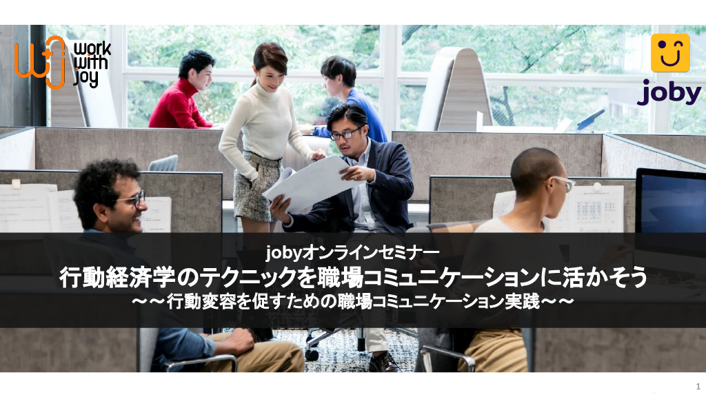 本資料は「行動経済学のテクニックを職場コミュニケーションに活かそう~行動変容を促すための職場コミュニケーション実践~」と題されたオンラインセミナー資料です。
