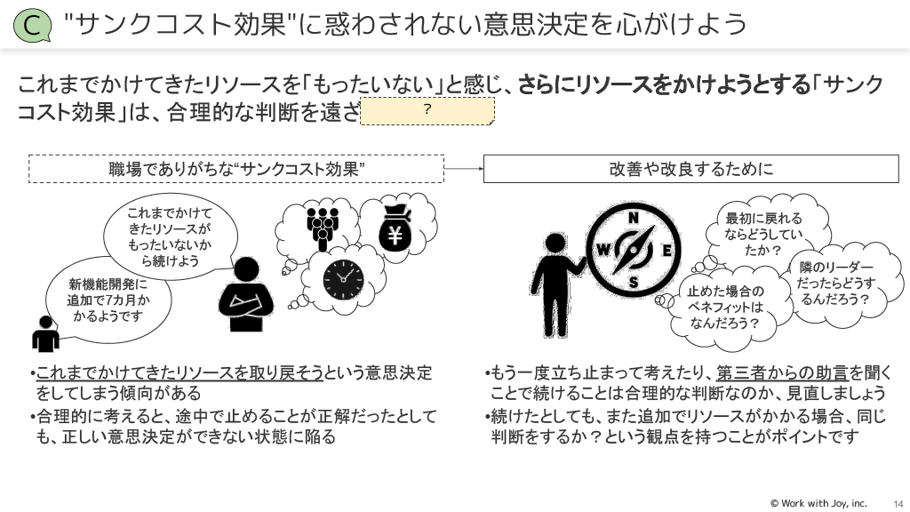 サンクコスト効果:「もったいない」と感じて合理的な判断を遠ざけることに惑わされず、途中で止めることも含めて見直しましょう。