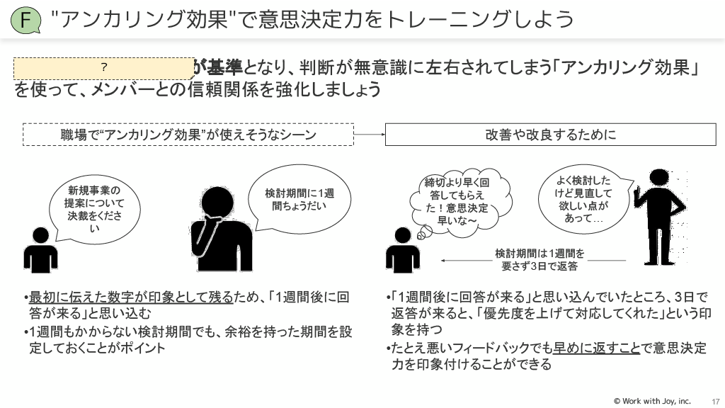 アンカリング効果:最初に伝えた数字が基準となり、判断が無意識に左右されることを利用して、余裕を持った期間を設定し、早く回答することで良い印象を与えられます。