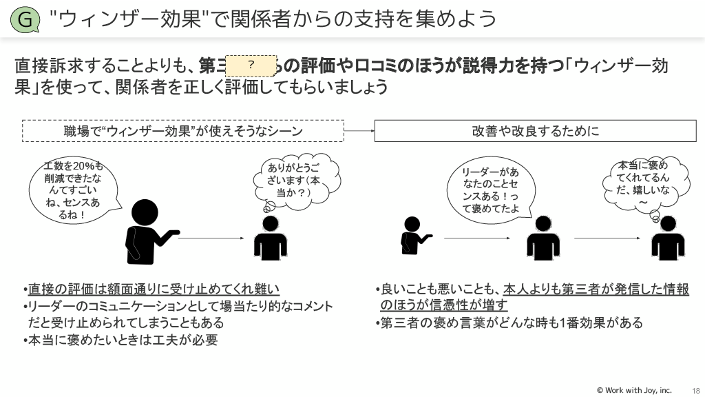 ウィンザー効果:直接褒めるよりも第三者の評価や口コミのほうが説得力を持つため、第三者の褒め言葉を活用します。