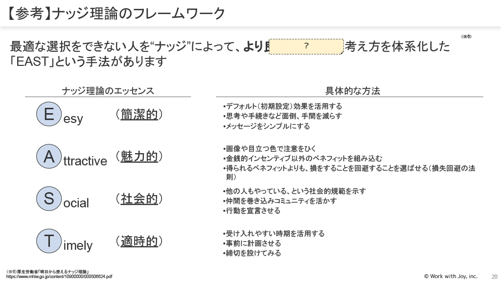 ナッジ理論:インセンティブや罰則を使わずに、自由な選択肢の中から最良の選択ができるよう、そっと背中を押すことで、望ましい行動に引き上げます。
