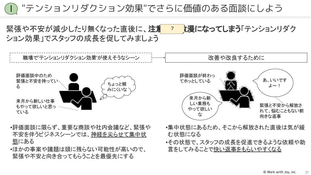 テンションリダクション効果:緊張や不安が減少した直後に気が緩む状態になることを利用し、そのタイミングで成長を促進するような依頼や助言をします。