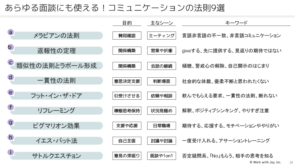 コミュニケーションの法則9選:メラビアンの法則、返報性の定理、類似性の法則とラポール形成、一貫性の法則、フット・イン・ザ・ドア・テクニック、リフレーミング、ピグマリオン効果、イエス・バット法、サトルクエスチョンが紹介されています。