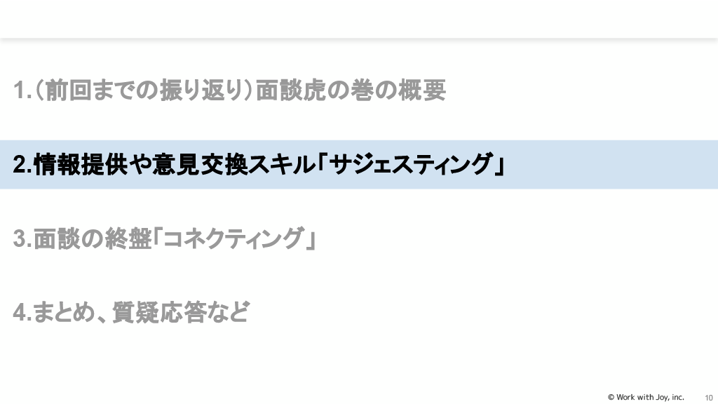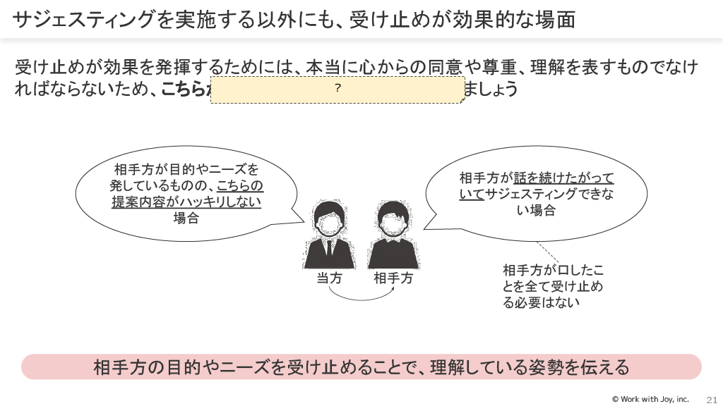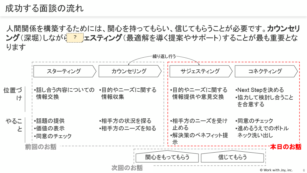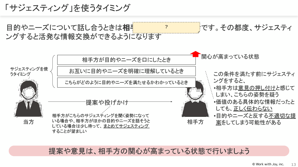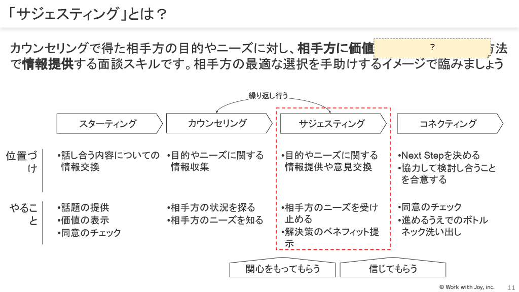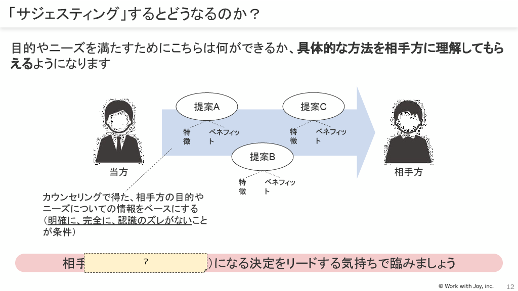 サジェスティングとは:カウンセリングで得た相手の目的やニーズに対して、相手に価値ある情報を提供し、最適な選択を手助けする面談スキルです。