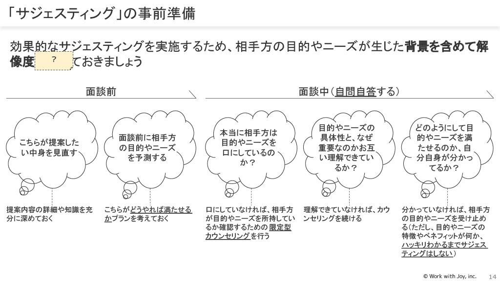 カウンセリング(深堀)しながら、サジェスティング(最適解を導く提案やサポート)することが最も重要とされます。