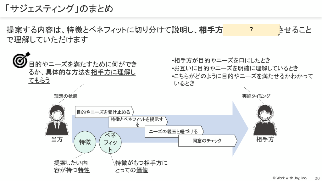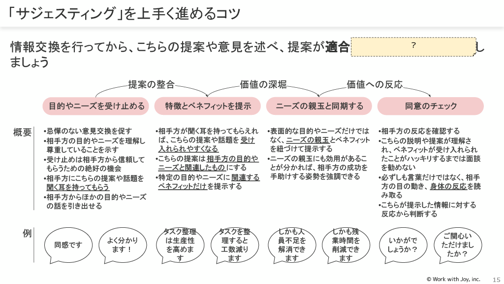 サジェスティングの流れ:目的やニーズを受け止める→特徴とベネフィットを提示する→ニーズの親玉と紐づける→同意のチェック。