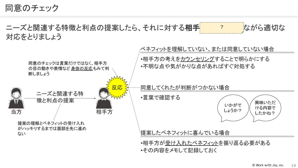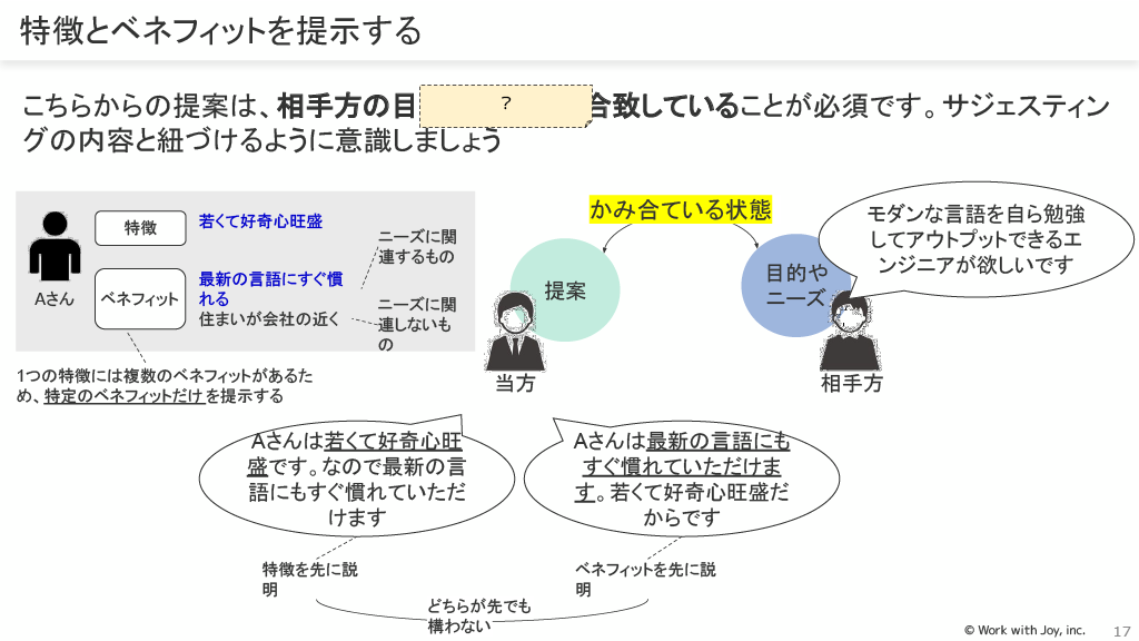 特徴とベネフィットの提示:こちらの提案は、相手の目的やニーズに合致していることが必須で、カウンセリングの内容と紐づけることを意識します。