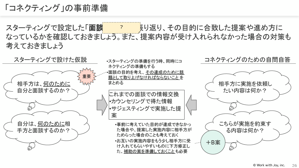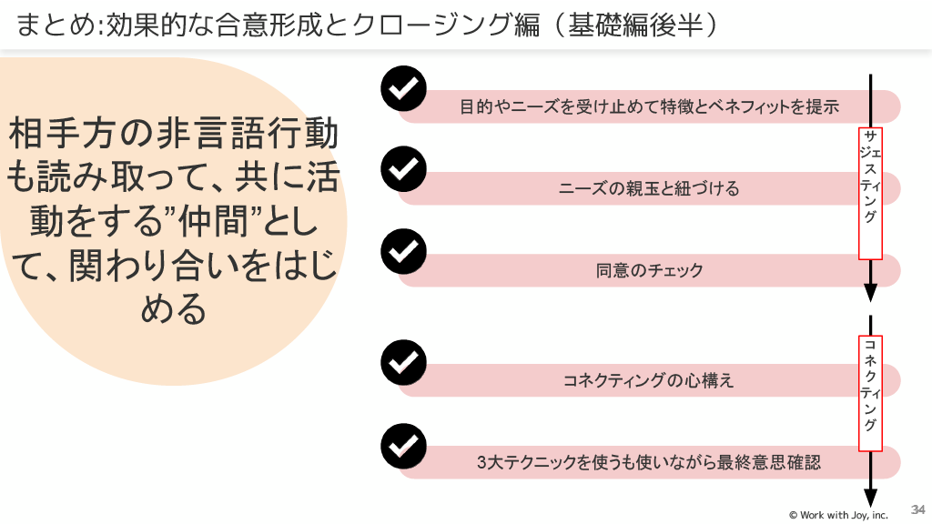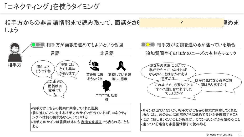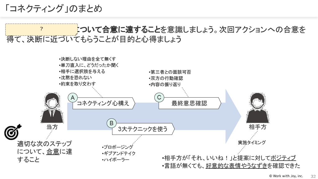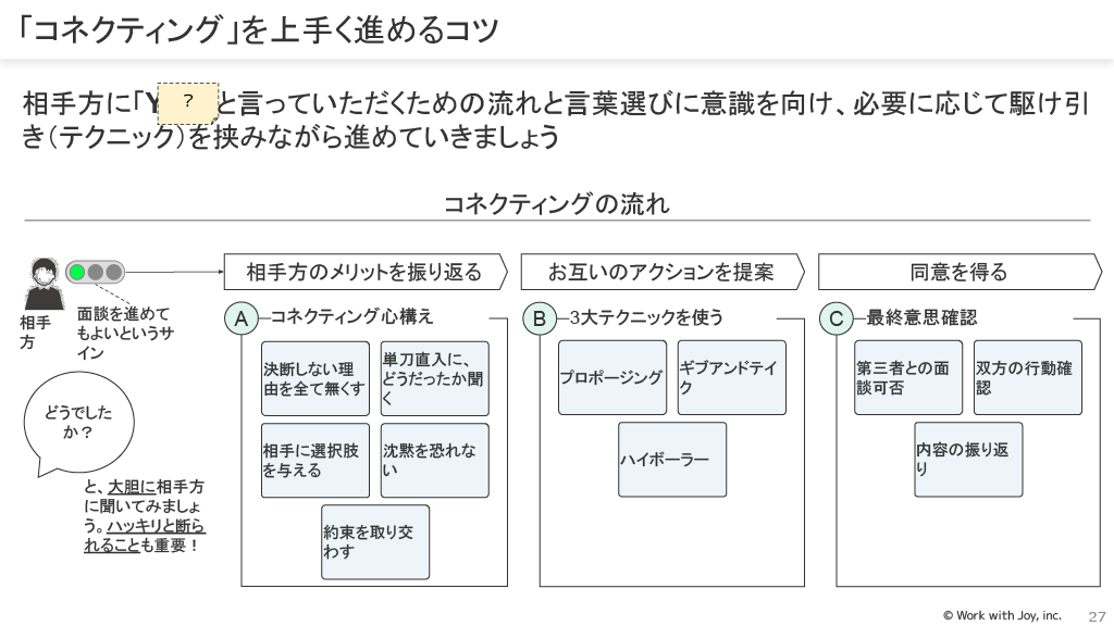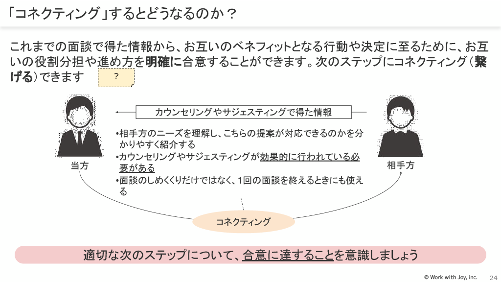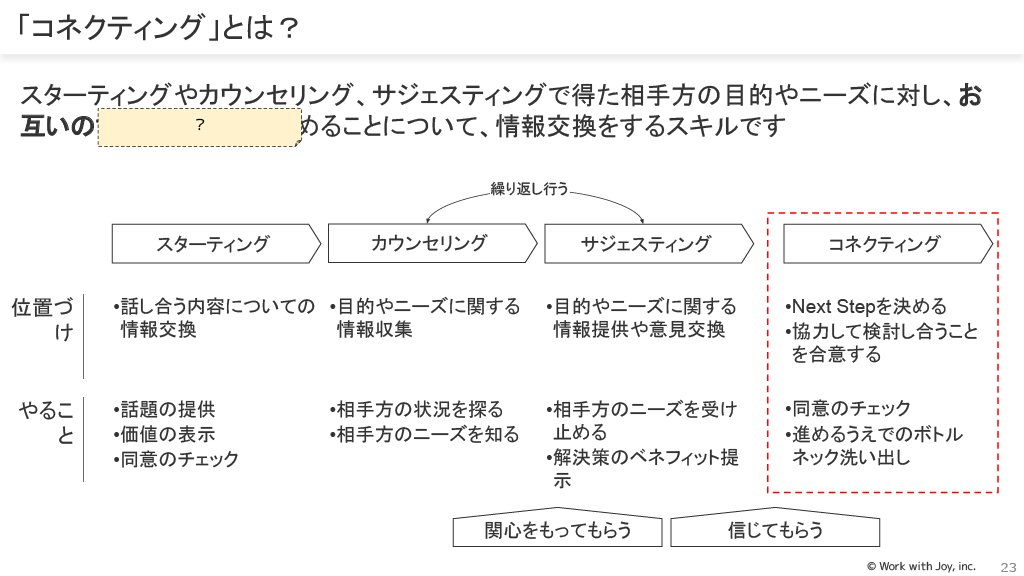 コネクティングとは:これまでの面談で得た目的やニーズに対し、お互いのベネフィットとなる行動や決定に至るために、役割分担や進め方を明確に合意するためのスキルです。