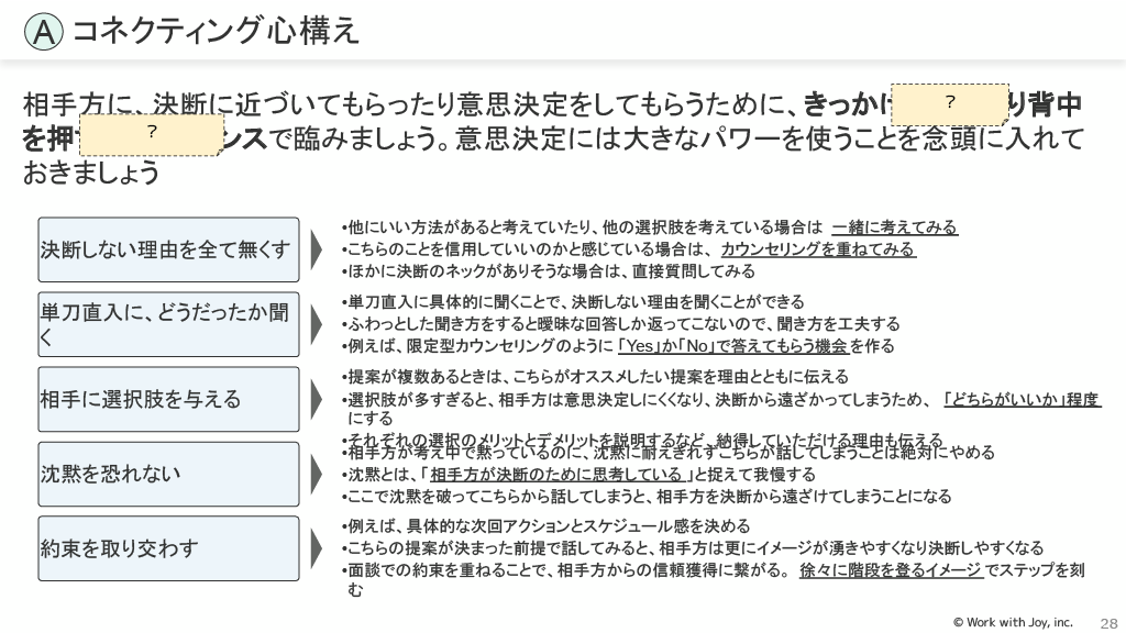 コネクティングの心構え:決断しない理由を全て無くす、単刀直入に聞く、相手に選択肢を与える、沈黙を恐れない、約束を取り交わすことが重要です。