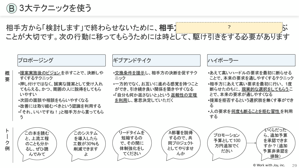 コネクティングを上手く進めるコツ:相手方のメリットを振り返る→お互いのアクションを提案→同意を得る、という流れを意識し、必要に応じて「プロポージング」「ギブアンドテイク」「ハイボーラー」の3大テクニックを使います。