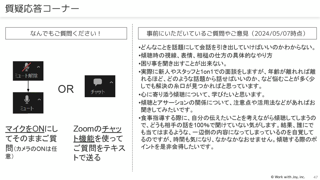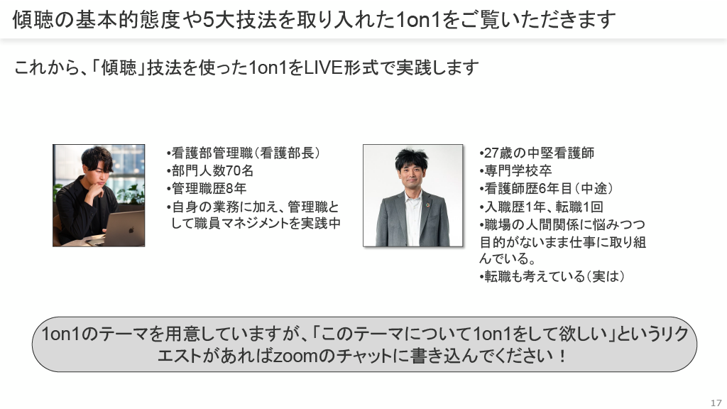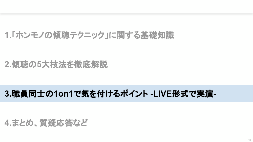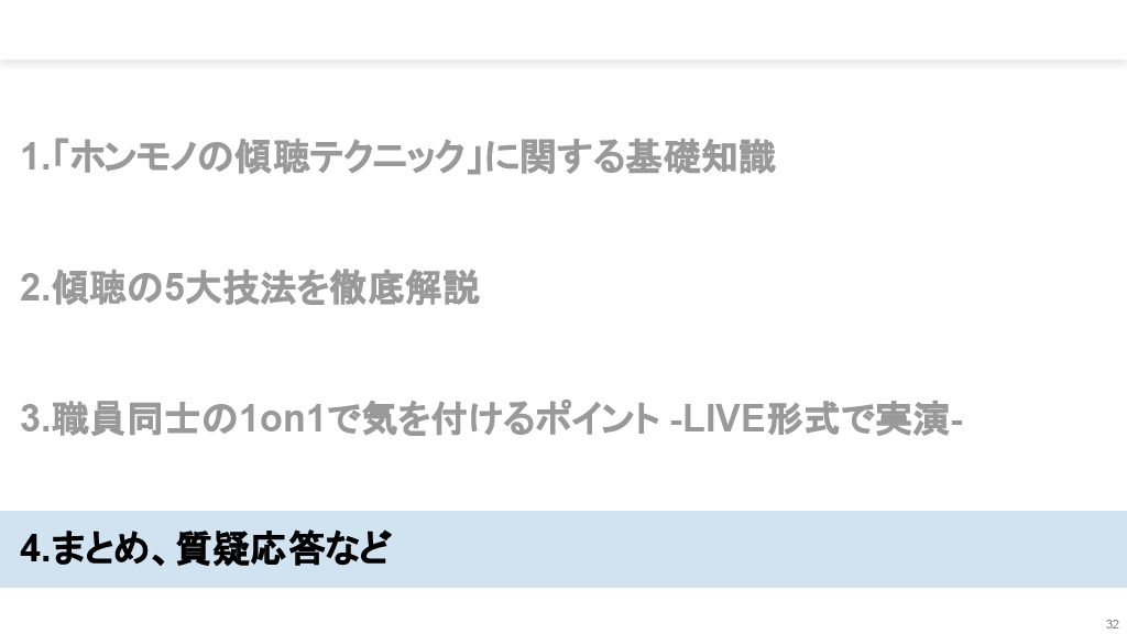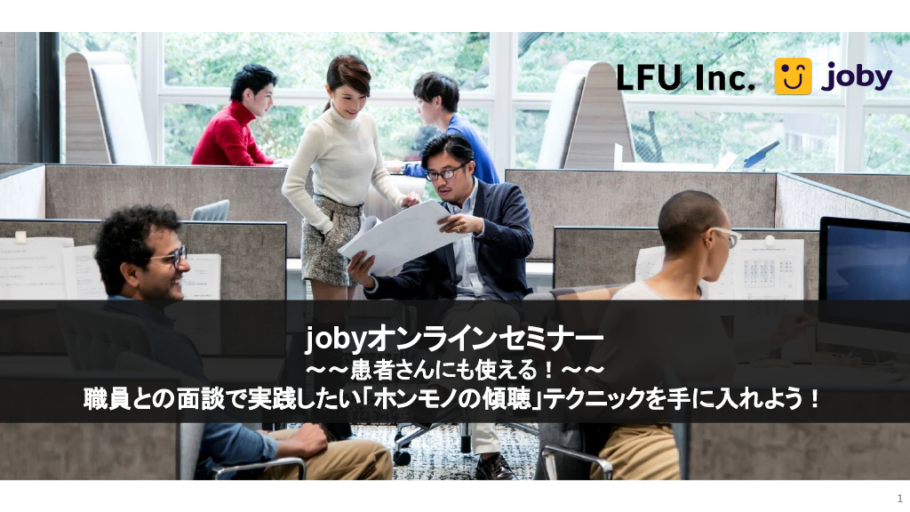 本資料は「職員との面談で実践したい「ホンモノの傾聴」テクニックを手に入れよう!」で、患者さんにも使える内容です。