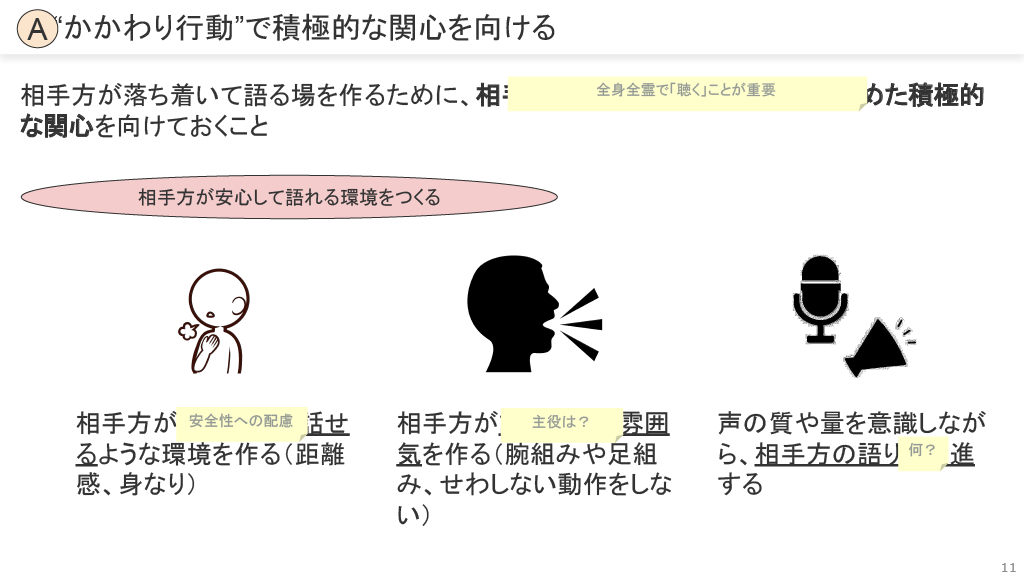かかわり行動(A): 積極的な関心を向け、相手が安心して語れる環境を作ります。