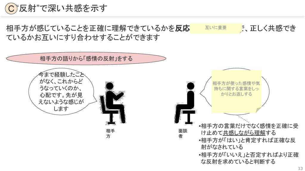 反射(C): 相手の言葉だけでなく感情を正確に受け止め、共感しながら理解できているかを確認します。