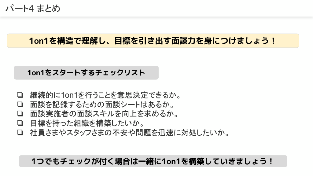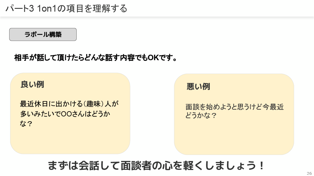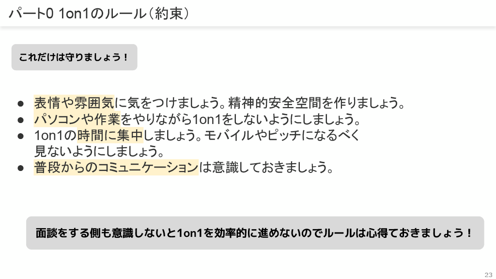 1on1のルールとして、「表情や雰囲気に気をつけ、精神的安全空間を作る」「パソコンや作業をやりながら行わない」「時間に集中する」「普段からのコミュニケーションを意識する」などがあります。