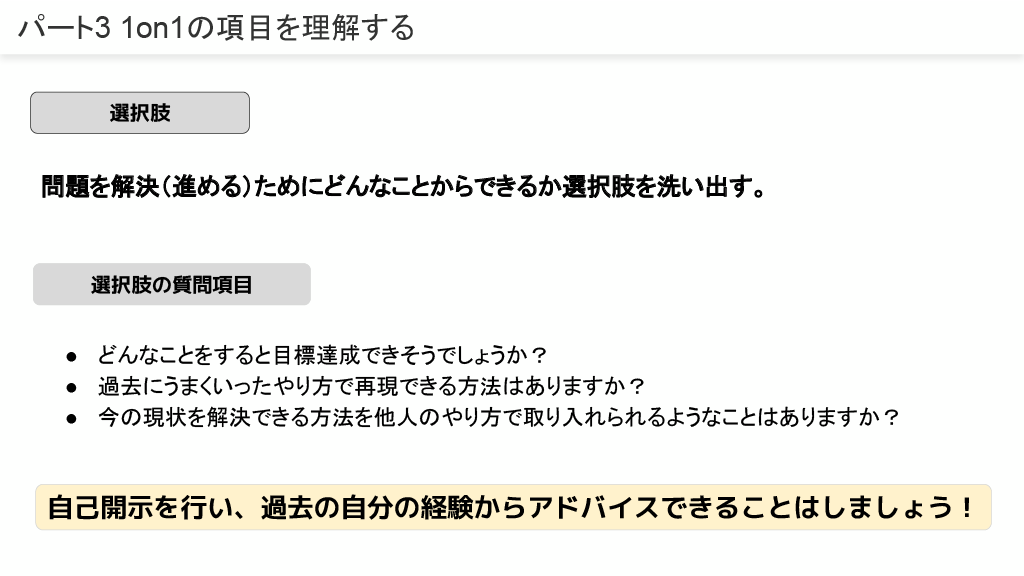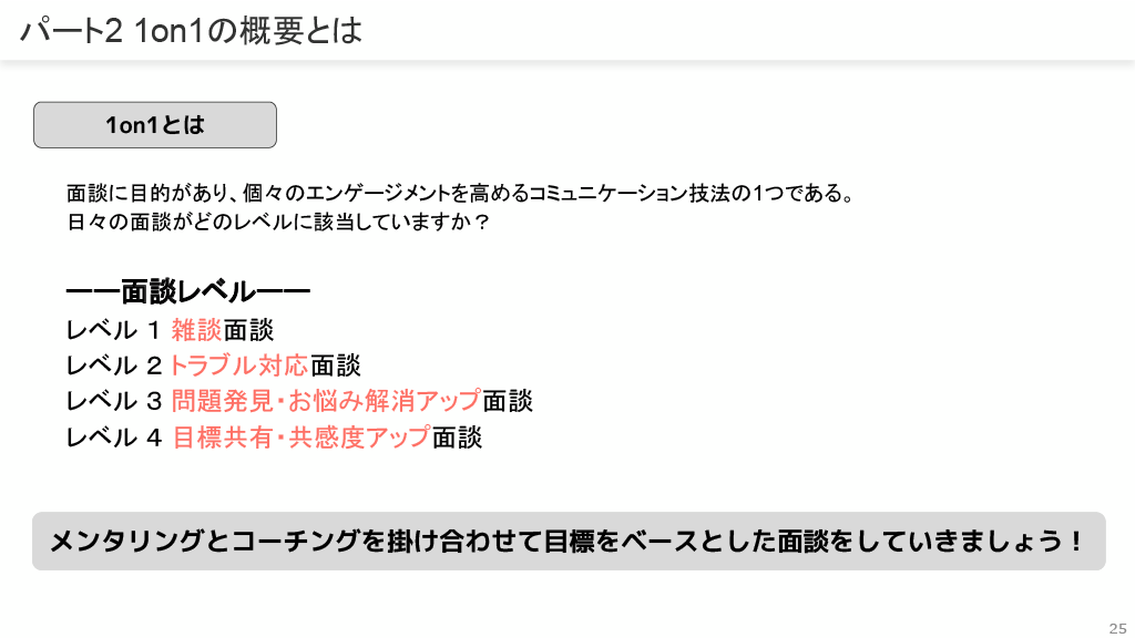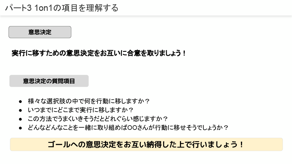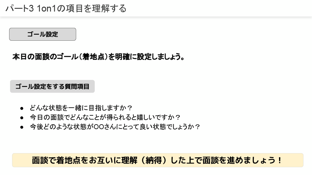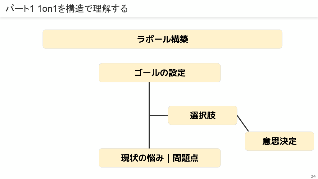 1on1は「ラポール構築」「ゴールの設定」「現状の悩み|問題点」「選択肢」「意思決定」の構造で理解し、目標をベースとした面談を目指します。
