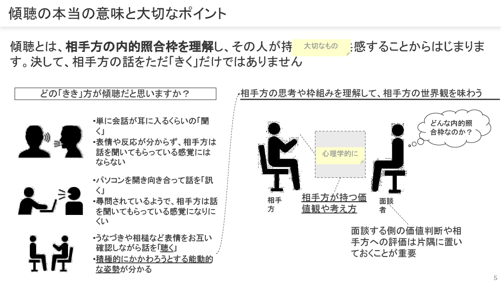 傾聴とは、相手方の内的照合枠(価値観や考え方)を理解し、その人が大切にしているものを感じ取ることから始まります。