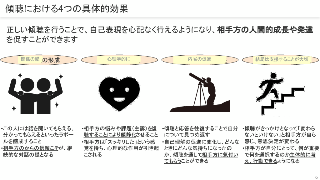 傾聴の具体的な効果には、「関係の礎の形成」「内省の促進」「自己理解の促進」「意思決定の変化」の4つがあります。