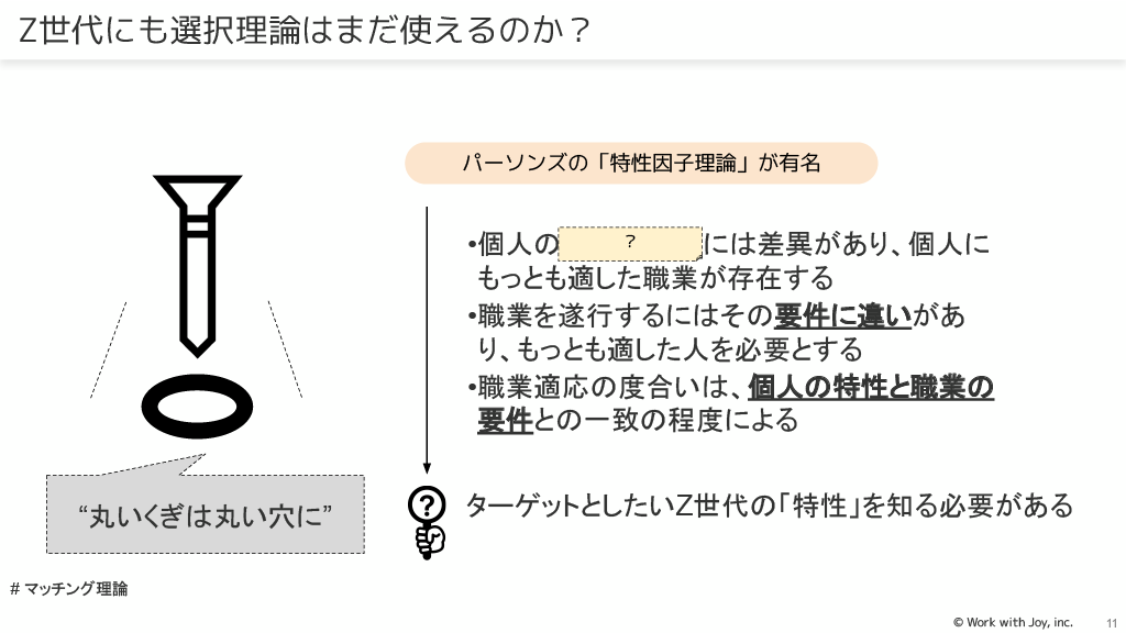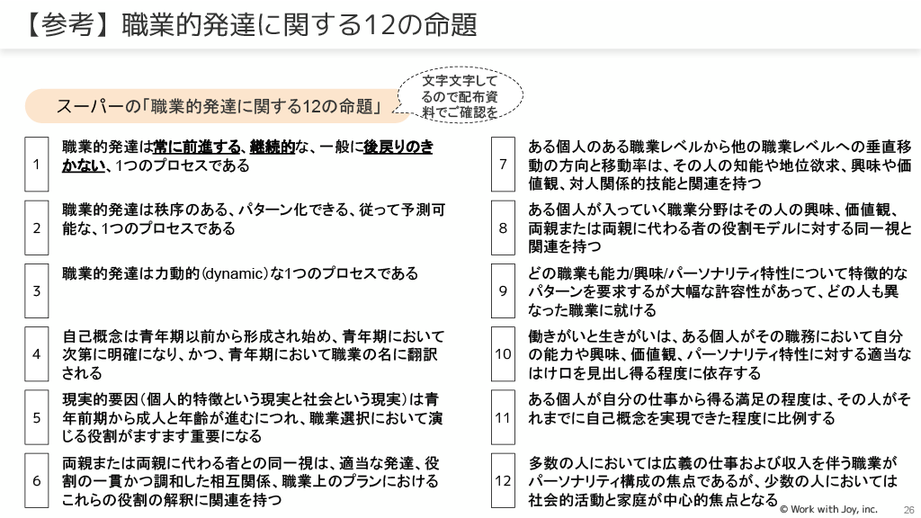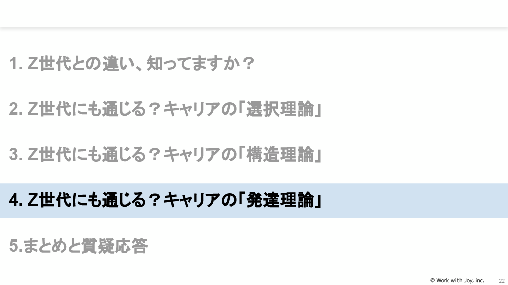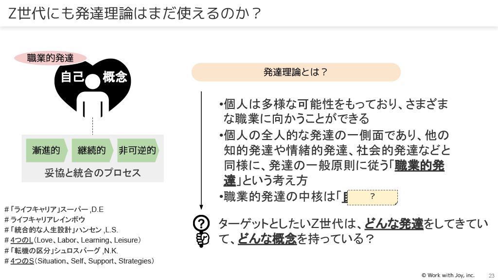 キャリアの「発達理論」では、Z世代がどのような発達をしてきて、どのような自己概念を持っているかを知ることが重要です。