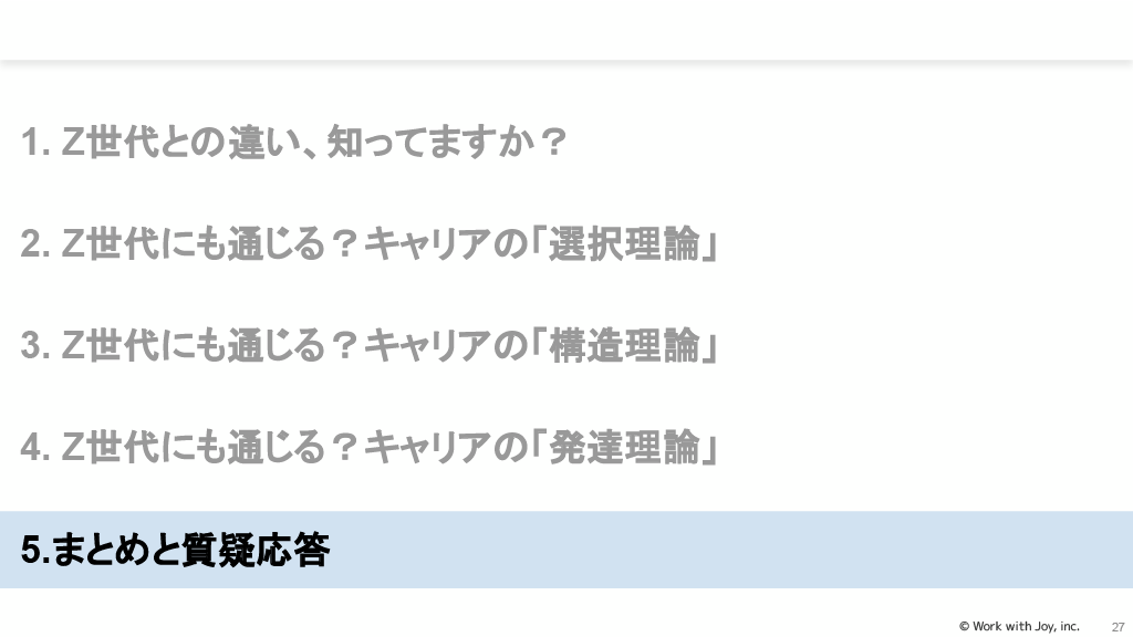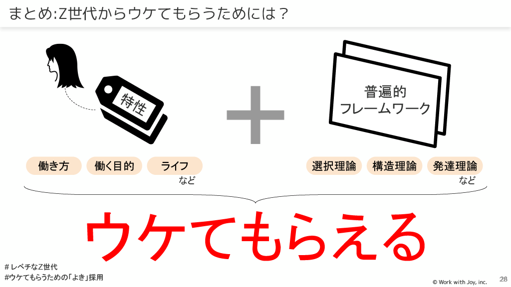 まとめとして、Z世代からウケてもらうためには、Z世代の「特性」や「働き方」「働く目的」「ライフ」といった要素と、「選択理論」「構造理論」「発達理論」などの普遍的フレームワークを組み合わせることが必要とされています。