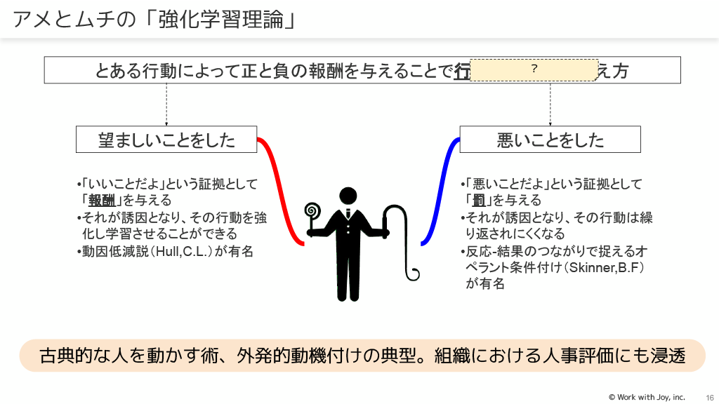 強化学習理論:正と負の報酬(アメとムチ)による行動変容。