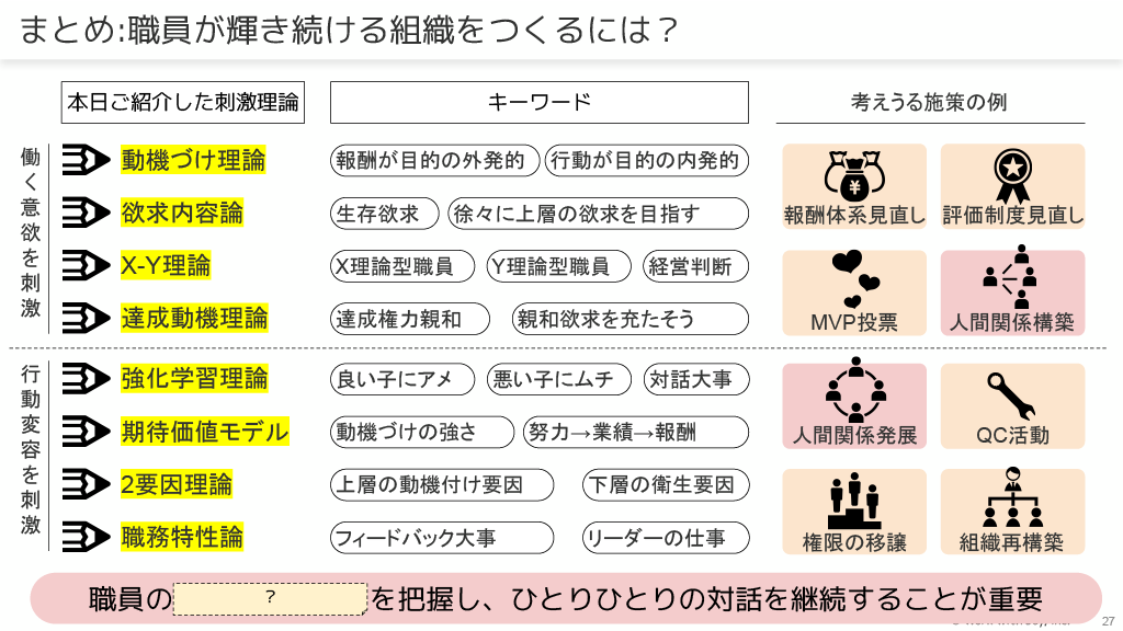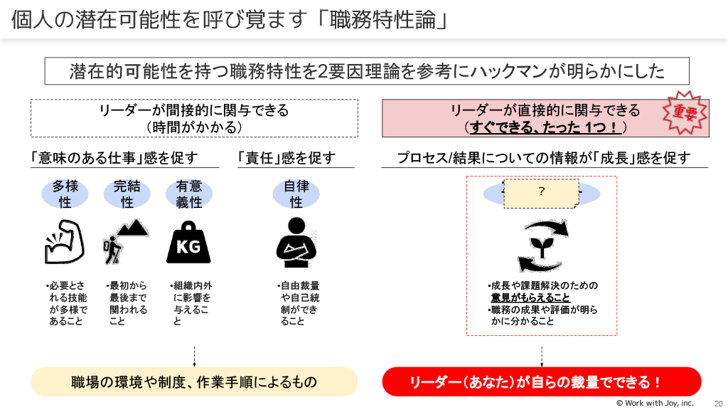 職務特性論(ハックマン):多様性、完結性、有意義性、自律性、フィードバック。