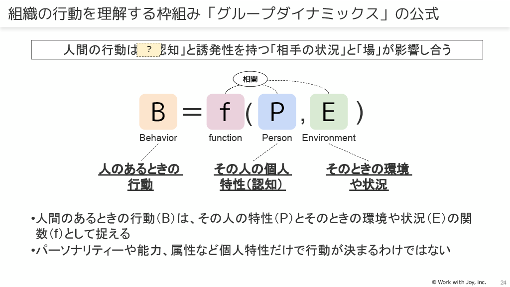 グループダイナミックスの公式:B = f(P,E)(行動は、個人の特性と環境・状況の関数)。