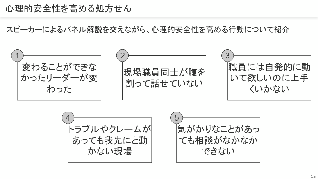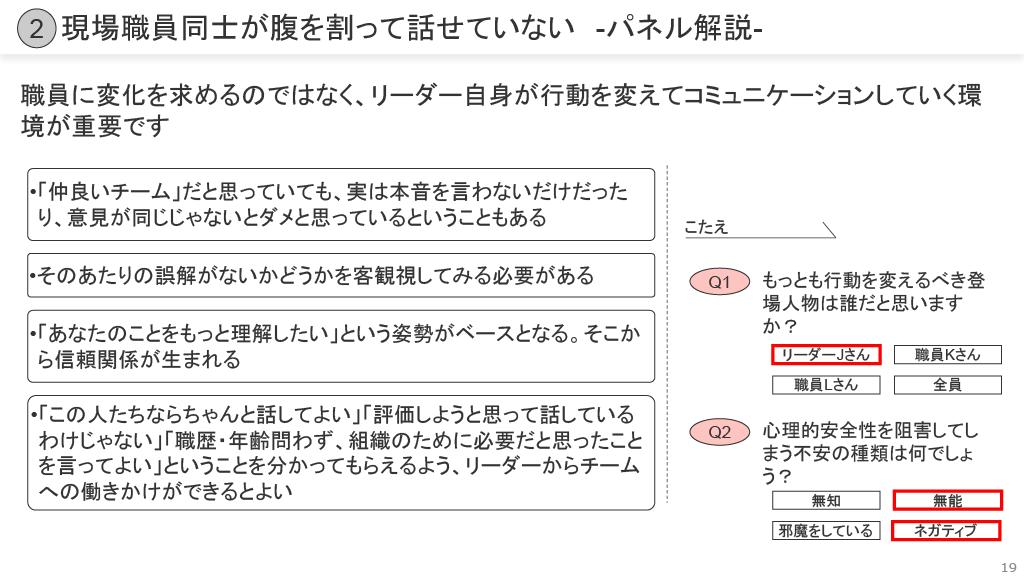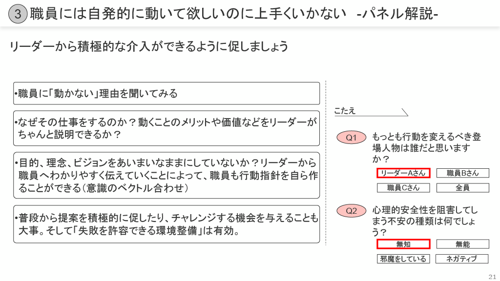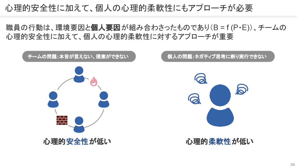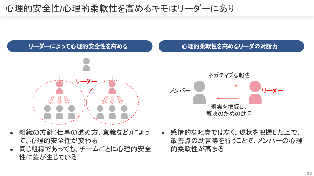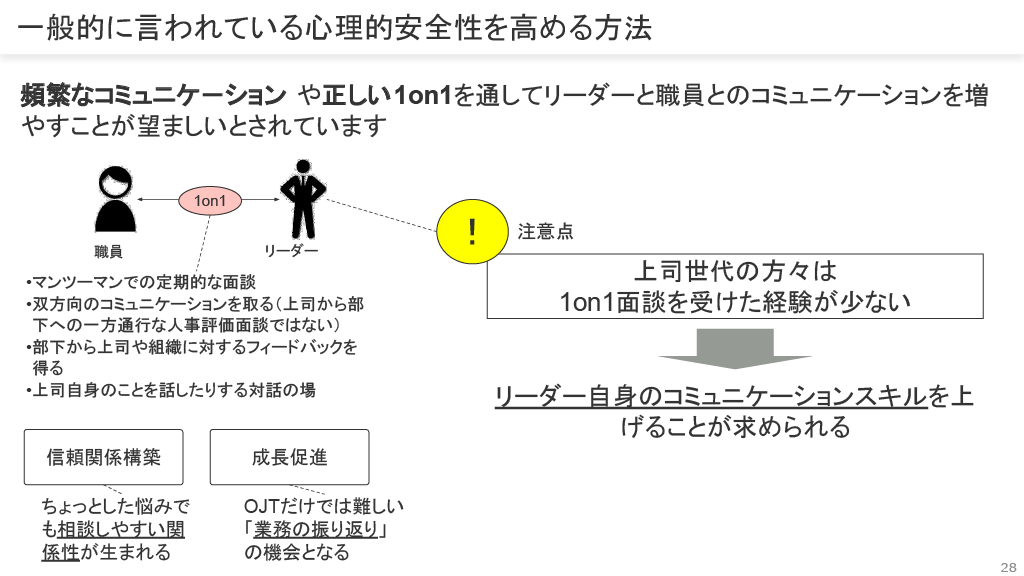 心理的安全性の引き上げ方:人間関係が良いことと心理的安全性が高いことは異なり、率直に意見を言い合える組織を目指す必要があります。リーダーが、頻繁なコミュニケーションや正しい1on1を通して、職員を理解している姿勢を示すことが重要です。