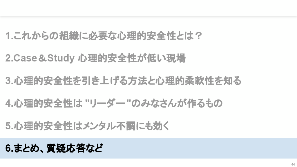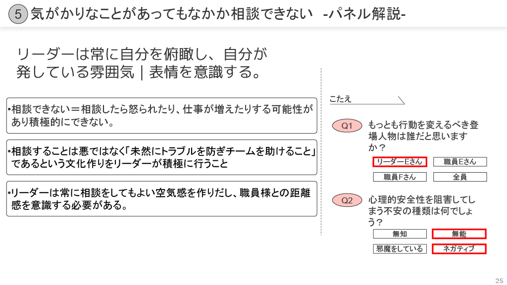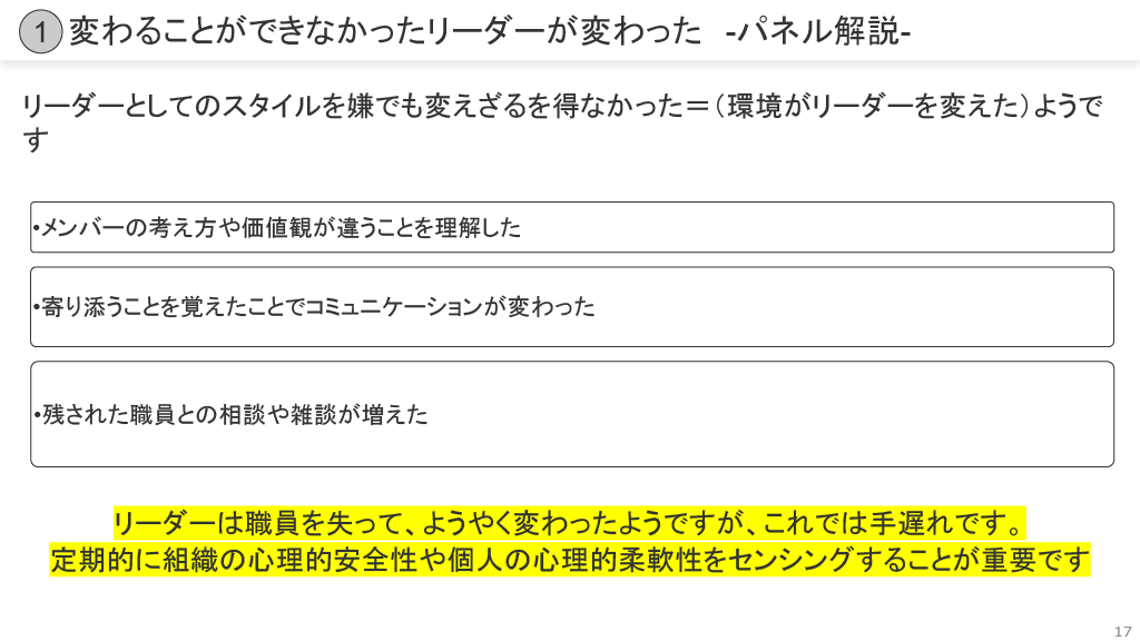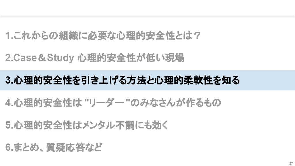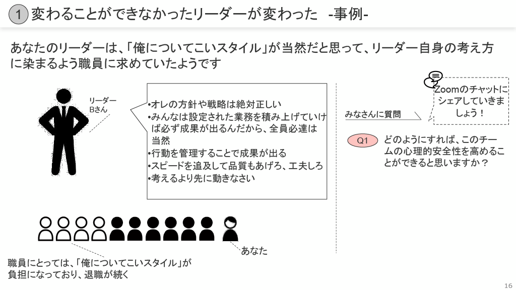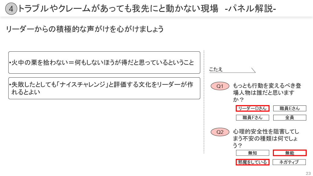 心理的安全性の引き上げ方:人間関係が良いことと心理的安全性が高いことは異なり、率直に意見を言い合える組織を目指す必要があります。リーダーが、頻繁なコミュニケーションや正しい1on1を通して、職員を理解している姿勢を示すことが重要です。