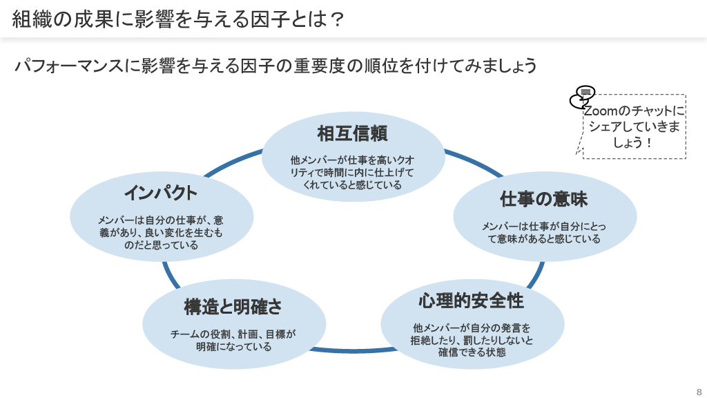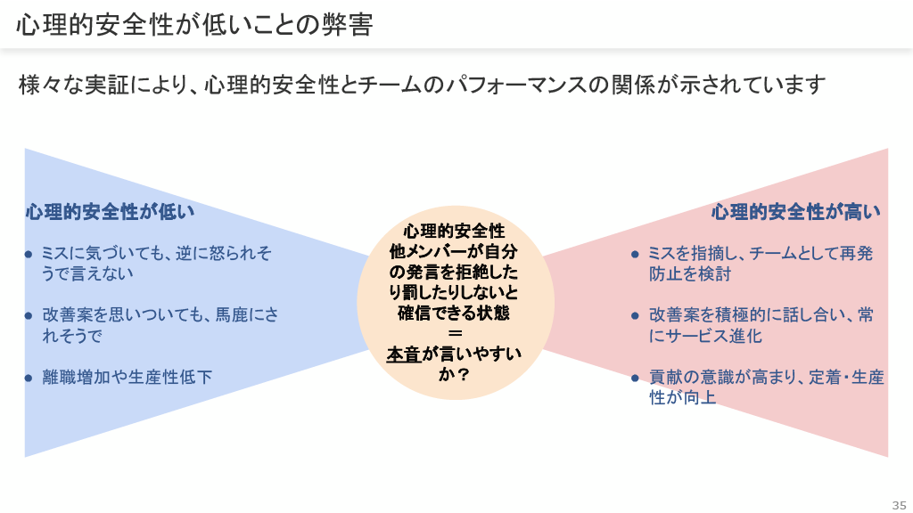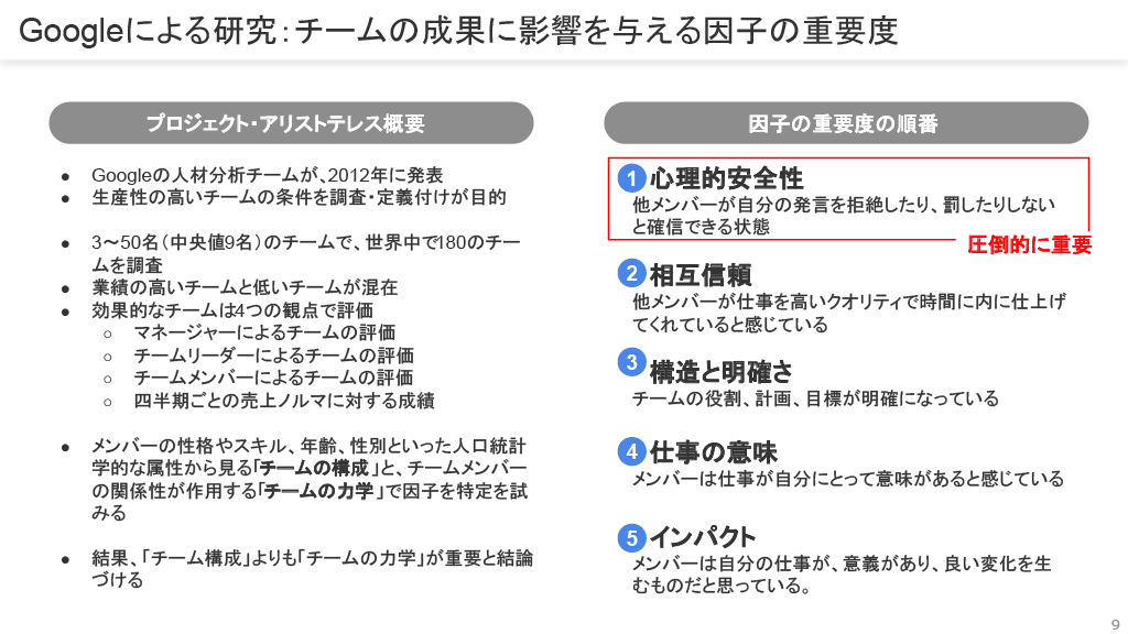 チームメンバー一人ひとりが恐怖や不安を感じることなく、安心して自分自身の考えを発言したり、行動できたりする状態を指します。Googleの調査「プロジェクト・アリストテレス」では、チームの成果に影響を与える因子のうち、心理的安全性が圧倒的に重要であると結論付けられています。