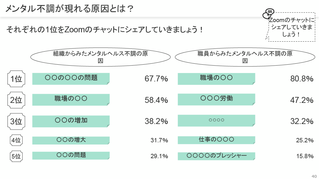 メンタル不調との関係:メンタル不調の原因について、組織は「本人の性格の問題」を1位とする一方で、職員は「職場の人間関係」を1位としており、特に「上司との人間関係」がメンタル不調の最も多い理由となっています。心理的安全性が高ければ、メンタル不調は起きづらくなると考えられます。